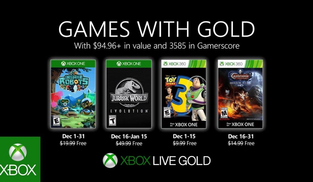 Ponuda za prosinac, usudit ćemo se reći, baš i nije pretjerano aktraktivna (svi znamo da oni veći i zvučniji naslovi idu u Game Pass..), a čine je Xbox One naslovi Insane Robots i Jurassic World Evolution, te Xbox 360 igre Toy Story 3 i Castlevania: Lords of Shadow – Mirror of Fate HD, koje su zahvaljujući backwards kompatibilnosti igrive i na Xbox One konzolama.
