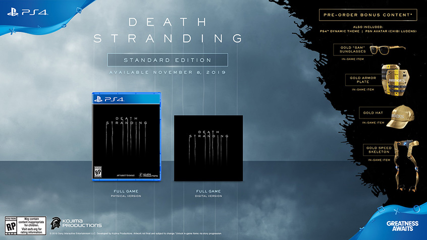 Standard Edition će koštati uobičajenih $59.99, a svi koji naprave prednarudžbu istog, odmah će dobiti vaučer za download Chibi Ludens PSN Avatara te Death Stranding dinamičku PS4 temu pri launchu igre. Pre-order ovog izdanja također sa sobom donosi i nekoliko bonus in-game itema (Gold “Sam” Sunglasses, Gold Hat, Gold Speed Skeleton i Gold Armor Plate).