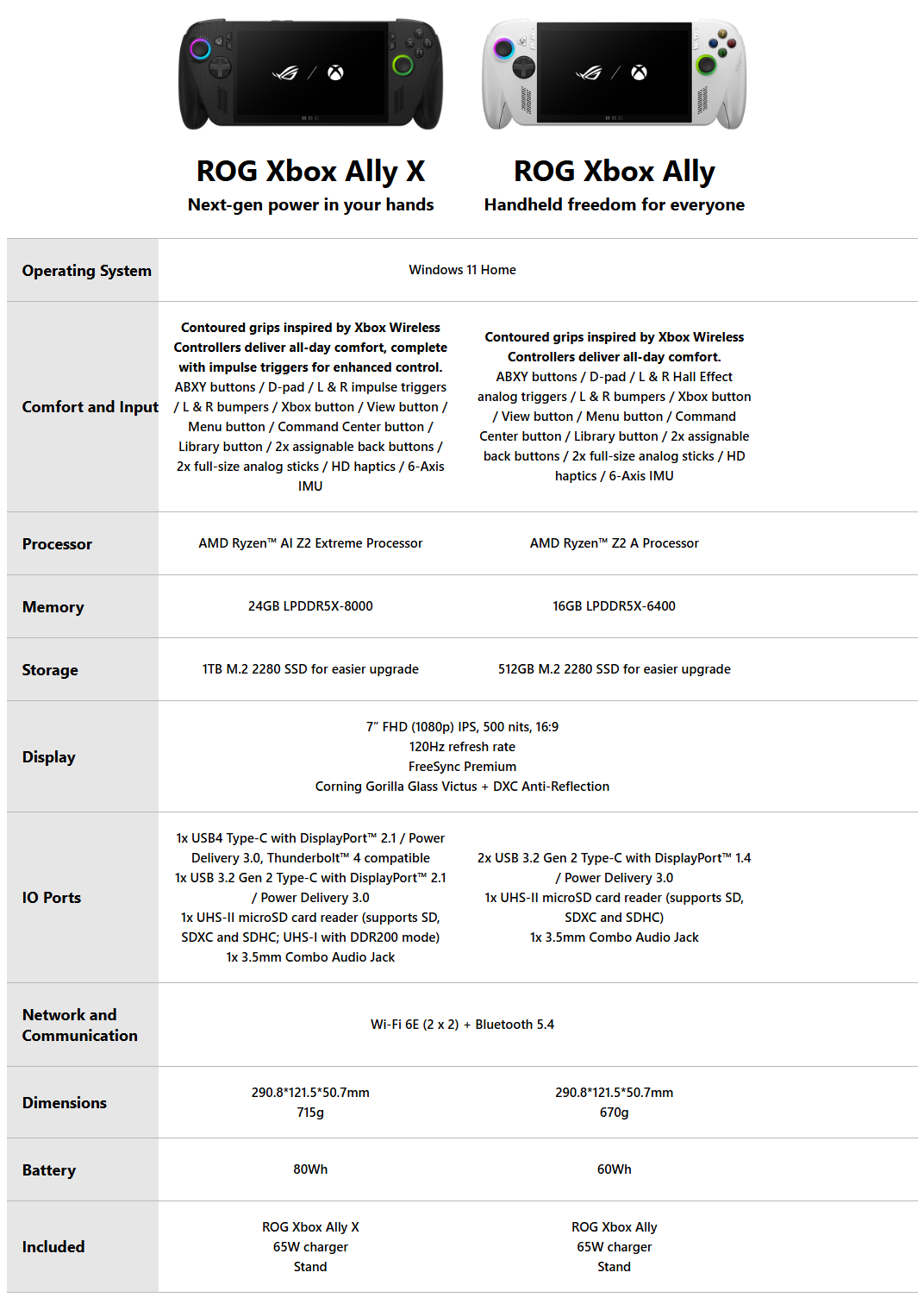 U pogledu napretka na prethodni Asusov proizvod, dostano novog stiže u novim Ally modelima s Xbox predznakom. Kako smo već spomenuli, nova Zen2 arhitektura procesora (AMD Ryzen Z2) koja će doći u dva “okusa” i popratnog hardvera. Slabiji Xbox Ally će imati Zen2 A CPU, dok će jači imati AI Zen2 Extreme CPU što vam već govori dovoljno da ih možete usporediti s prošlom generacijom Ally handhelda (po pitanju cijene barem). Tako se filozofija novih uređaja čini identičnom kao kod prethodnika iz Ally serije što uključuje i cijenu (apsolutni misterij trenutno) koja će vjerojatno biti formirana u istoj maniri kao i u prvoj Ally generaciji. To konkretno znači da će slabiji model biti skup, a jači model još skuplji. Jednostavno, zar ne?