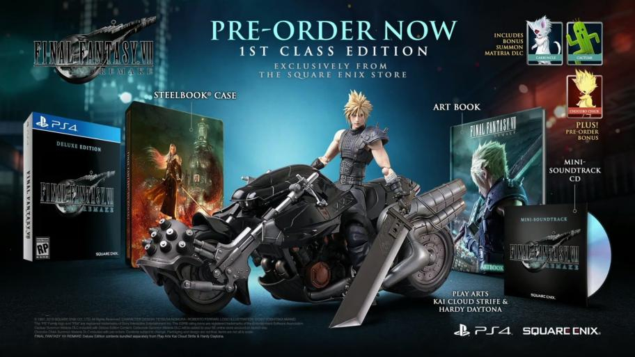 Za one s dubljim džepom i debljim novčanikom, tu je i 1st Class Edition, koji će koštati vrtoglavih $329.99 te će ga biti moguće kupiti isključivo putem Square Enixovog storea. Radi se o ultimativnoj kolekciji za sve FF fanove u kojem će se naći kompletan sadržaj Deluxe Editiona te ekskluzivna Statua Clouda Strifea s njegovim motorom i mačem, kreirana od strane Play Arts Kaija.
