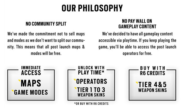 Mape i modovi bit će besplati i automatski će biti otključani za sve igrače, dok će za otključavanje operativaca i oružja biti potrebna Renown valuta ili R6 krediti, koje će biti moguće zaraditi kroz igru ili kupiti za pravi novac. Igračima će na raspolaganju biti vaučeri od 600, 1200, 2670, 4920 i 7560 R6 kredita.