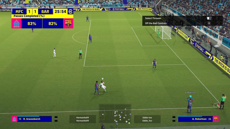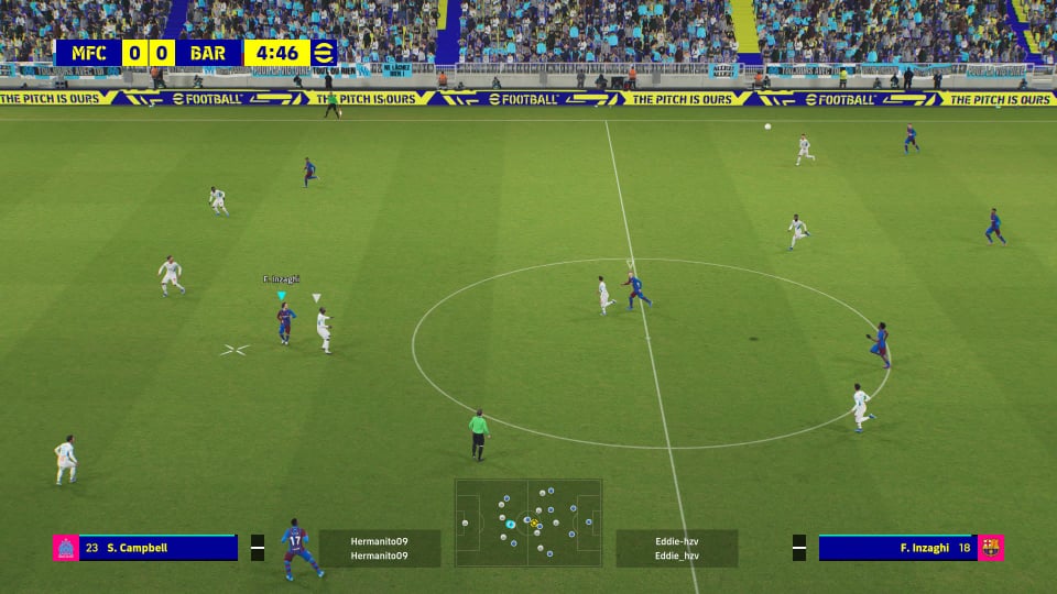 Prebacimo se na onu daleko najbitniju stvar, a to je naravno gameplay. Povratak igre na neke stare kontrole i opcije donio nam je hibrid PES-a 2021, mobilne igre i eFootballa. Jedan od najočitijih problema prvotne verzije uz samu promjenu kontrola bio je i neočekivani nestanak presinga sa drugim igračem, te užasno odrađen način igranja obrane. Presing sa drugim (AI kontroliranim igračem) je sada opet tu, ali nije dobar. Na stranu što se izvodi pomoću R1 tipke (to možete i promijeniti), igrač koji izvršava presing radi to izuzetno neinteligentno. Da pojasnim, kada ga aktivirate taj igrač otprilike kao bik ide točno na loptu i ništa drugo, a svaka promjena smjera lopte ga apsolutno izbacuje iz tračnica i donosi komično kretanje, vrtnju u krug oko protivničkih igrača i generalnu neefikasnost. Presing je koristan u određenim situacijama gdje je igrač pozicioniran točno i u svojoj putanji može presjeći liniju dodavanja, pa čak i oduzeti loptu, no sve je to previše situacijski uvjetovano da bi konzistentno funkcioniralo. Kad u to uključimo i činjenicu da AI ponekad valjda nasumično bira igrača koji ide u presing dobivamo nešto što iskreno više šteti nego pomaže. Dojma sam da je Konami nakon outragea igrača vratio opciju presinga sa drugim igračem, ali su to odradili poprilično bazično i rezultatski dosta loše, neusporedivo sa npr. PES-om 21 gdje taj presing isto nije bio nešto posebno dobar, ali ipak miljama ispred ovoga što sada imamo. Igranje obrane je sada malo bolje nego u prvotnoj verziji, ali još uvijek daleko od dobroga. Pomoću X tipke još uvijek pratimo igrača, a pri prilasku imamo opcije kocke, L2 tipke ili kruga za razne tackle-ove. Oni sami po sebi nisu loši, ali problem koji se ovdje javlja je suđenje, tj. nedostatak ikakvog kriterija. Za nepostojeće prekršaje ćete u određenim situacijama dobiti i crvene kartone, dok se za neke brutalne startove ne dogodi ništa. Zaista random.