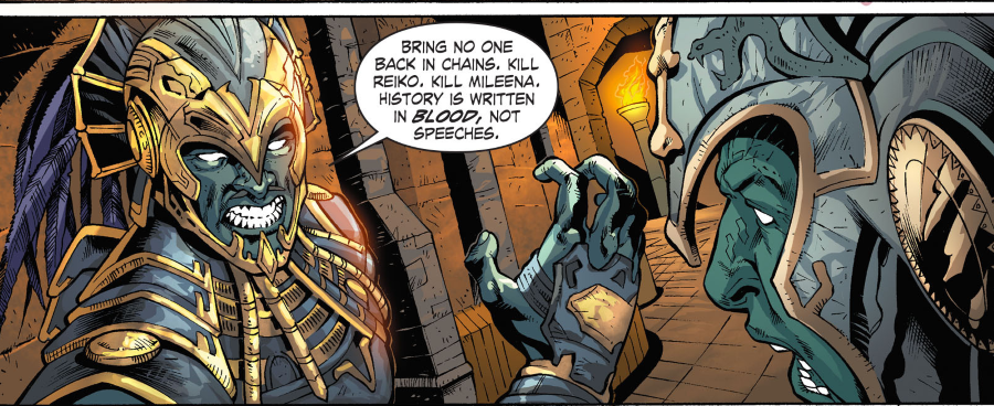 Jedan od bodeža koji je česti motiv u svim brojevima stripa napokon je i dobio svoj origin u zadnjem broju. Zadnji broj, koji je dosta sporiji i mirniji od nekih prijašnjih nabijenijih brojeva, objašnjava da postoji veći broj tih bodeža koji spojeni zajedno oslobađaju davno zatvorenog Shinnoka. Raiden je bodeže dao na čuvanje raznim ratnicima diljem EarthRealma pa tako je jedan dao i Scorpionu. No upletanje određene mračne magije čini sve one koji posjeduju bodež (a ne znaju njegovu pravu svrhu) psihotičnim ubojicama, što smo vidjeli do sada na par primjera u stripu, pa u konačnici i na Raidenu. Također, dobili smo i još malo pozadine za Scorpiona i kako ga je Kenshi spasio od ”tame” koja ga je činila zlim likom vođenim željom za osvetom a kasnije i samim nasiljem bez obzira o kome se radilo. Scorpion se, polako ali sigurno, pretvara u jednog od glavnih junaka priče koja će pratiti igru no toliko se toga događa oko svih ovih frakcija, bodeža i u objavljenim trailerima za igru da je teško razaznati koji su glavni protagonisti, a tko antagonisti ove igre. Ono što je očito jest da su ili Reiko ili osoba koja stoji iza njegovih planova glavni anmtagonisti i mogući bossevi u story modeu igre no zasada je teško predvidjeti o kome se radi. Hoće li nam strip dati odgovor prije ili nakon izlaska igre, ostaje da vidimo. Shinnok svakako je glavna prijetnja, no bilo bi prejednostavno da u konačnici on (ili neki njegov novi oblik) bude mastermind iza svega što se događa.