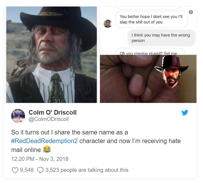 Naime, jedna od rivalskih bandi s kojima se u igri susreće glavni protagonist Arthur Morgan i Van der Lindeova banda jeste i ona kojom upravlja izvjesni Colm O’Driscoll, a kako je O’Driscoll prezime koje su igri često spominje u negativnoj konotaciji, mržnja RDR2 igrača prema prezimenu O’Driscoll preselila se i u stvarni svijet, pa su se mnogi koji su na bilo koji način povezani s tim prezimenom našli na meti fanova.