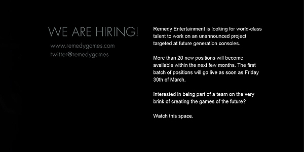 Remedy Entertainment, tim zadužan za stvaranje Alan Wake franšize, razvija novi naslov za konzole sljedeće generacije. Možda je previše reći da je naslov u fazi razvoja, jer zapravo se radi tek o prikupljanju ljudi za budući projekt. No, kako možemo vidjeti u objavi na njihovom službenom forumu, Remedy Entertainment trenutno regrutiraju nove snage u svoj tim.