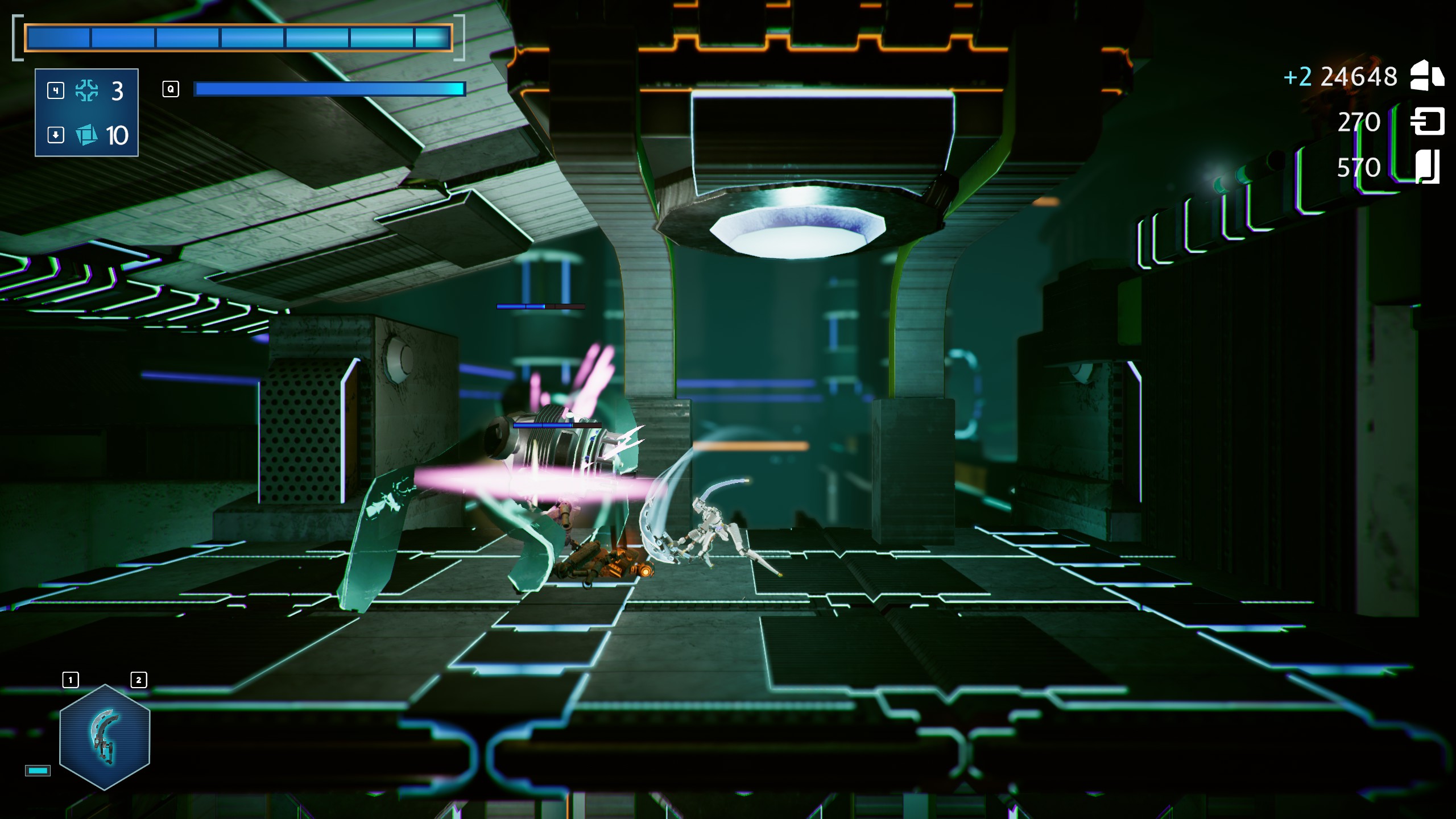 No, ono što treba naglasiti da je sama borba po sebi zabavna. Pariranje je jako dobro, izbjegavanje je jako solidno jer tjerate neprijatelje da se okreću i lijevo i desno, a imate i nekoliko posebnih napada kao što je, primjerice, hakiranje, kako bi načinili što veću štetu neprijateljima. Uz to, tu su i tri posebna oružja i razni shopovi preko kojih možete kupovati razne modifikacije i nadogradnje. Sve to jako je dobro povezano i solidno odrađeno.