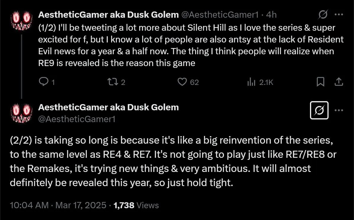 Poznati insider Dusk Golem aka AestheticGamer podijelio je male, ali značajne detalje o nadolazećem naslovu. Na društvenoj mreži X (bivši Twitter), Dusk Golem je istaknuo da Capcom s Resident Evilom 9 nastoji reinventirati cijeli serijal, što je i razlog dugotrajne pripreme i odsutnosti službenih najava.