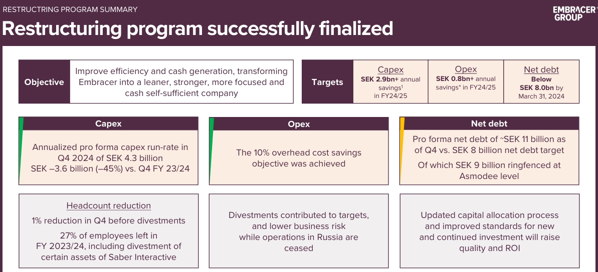Gledajući unaprijed, Embracer planira izdati više od 70 igara u fiskalnoj godini 2024/2025, uključujući visoko očekivane naslove kao što su Kingdom Come: Deliverance II i Killing Floor 3. S druge strane, što se tiče ključnih franšiza kompanije kao što su Darksiders, Dead Island, Deep Rock Galactic, Kingdom Come: Deliverance, Killing Floor, The Lord of the Rings, Metro, Remnant, Satisfactory, Tomb Raider i Wreckfest, očekuje se da će nastaviti rasti njihova popularnost.