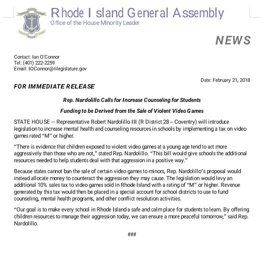 Tako se nakon guvernera Kentuckyja koji je očigledno pod utjecajem uvijek iritantnog Jacka Thompsona, pa čak i predsjednika SAD-a Donalda Trumpa, oglasio i predstavnik Rhode Islanda Robert Nardolillo koji je problemu pristupio s ekonomske strane, predloživši povećanje poreza na nasilne igre.