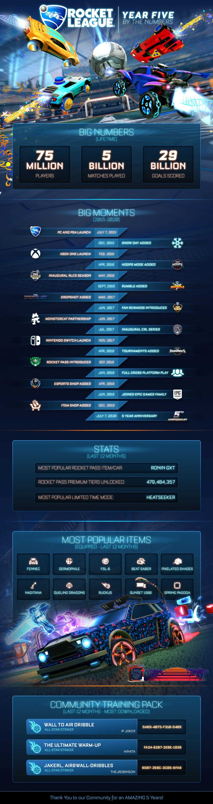 Developer Psyonix je proslavio ovu informaciju sa izdanom infografikom koja prikazuje razne zanimljivosti vezane za ovu igru, i rast njene popularnosti otkad je izala. Počivavši u početku prvenstveno na dobrom glasu i preporukama nekih koji su zaigrali igru, te PS Plus akciji koja je mnoge potaknula da je isprobaju bez dodatnog troška, dovela ju je do ukupnog broja od 75 milijuna igrača/ica, 5 milijarde odigranih mečeva i preko 29 milijardi zabijenih golova.