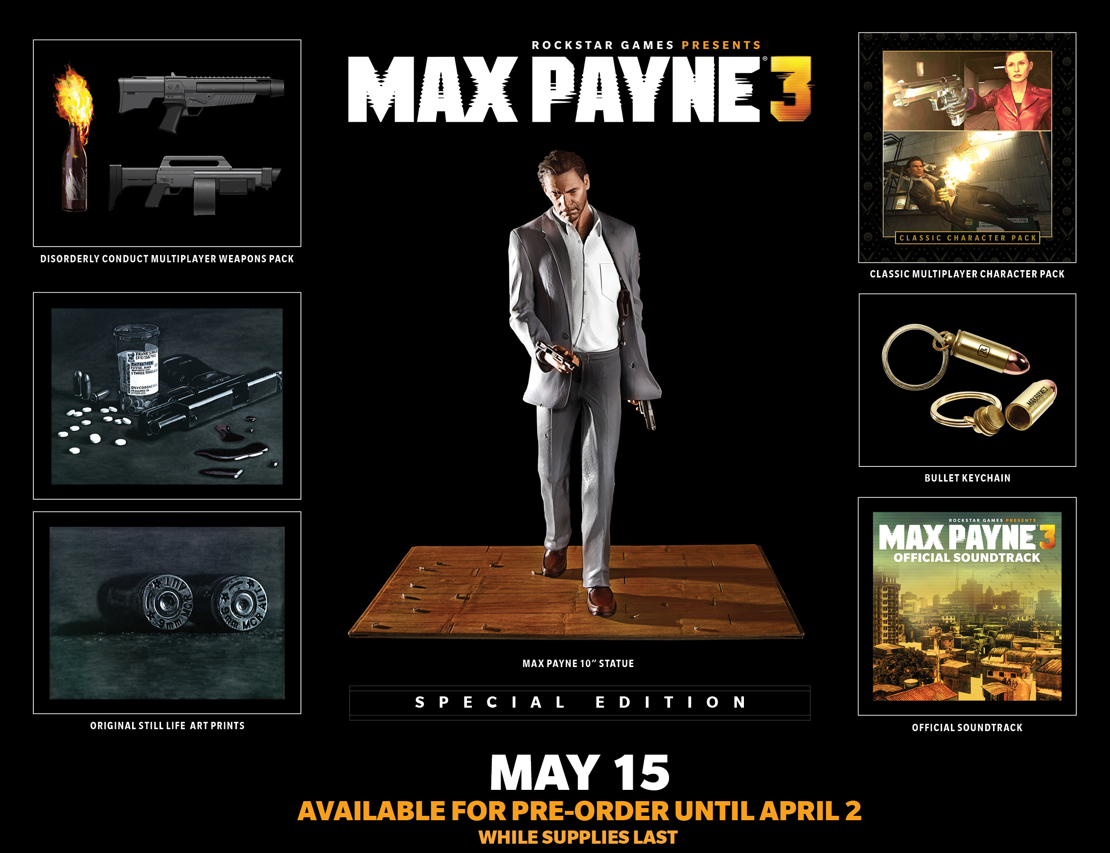 Ubrzo nakon razočaravajuće vijesti koju nam je priredio Rockstar Games, dobili smo i malo “iskupljenje” u obliku dodatne ponude za sve fanove koji se odluče na preorder novog nastavka Max Payne serijala. Rok za predbilježbu Max Payne 3 Special Edition verzije igre je pomaknut do 2. travnja 2o12. Ujedno je objavljeno da je jedini način da se dokopate ove specijalne verzije igre upravo preko predbilježbe, jer se ovakav paket neće prodavati kao retail u trgovinama.