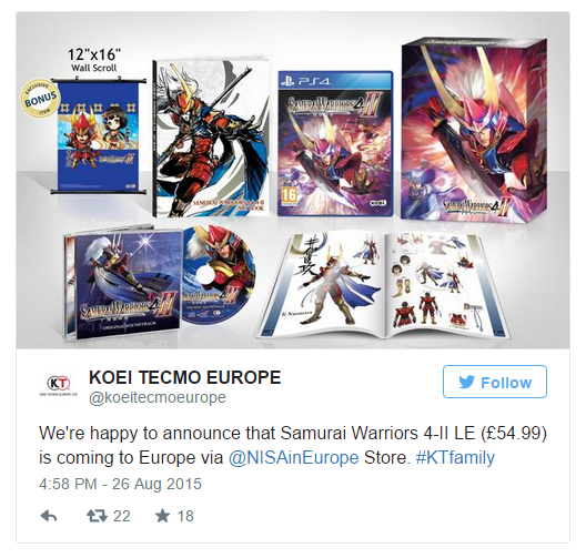 Naime, Koei Tecmo Europe putem Twittera je potvrdio Zapadni izlazak Samurai Warriors 4-II Limited Editiona, koji će se sastojati od:
