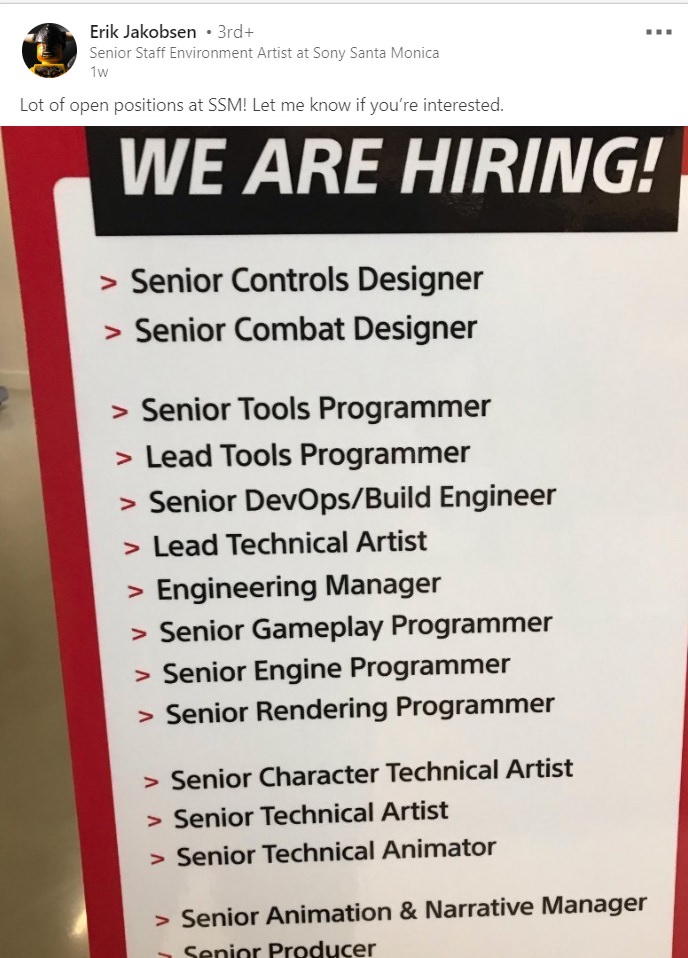Da Sony Santa Monica definitivno sprema velike projekte, najbolje svjedoči post Erika Jakobsena koji je putem LinkedIna objavio oglas za priličan broj novih radnih mjesta, od pozicije višeg producenta, pa sve do višeg dizajnera borbenih sekvenci koji bi ovim studiom surađivali na duže staze, radeći na dva buduća projekta.