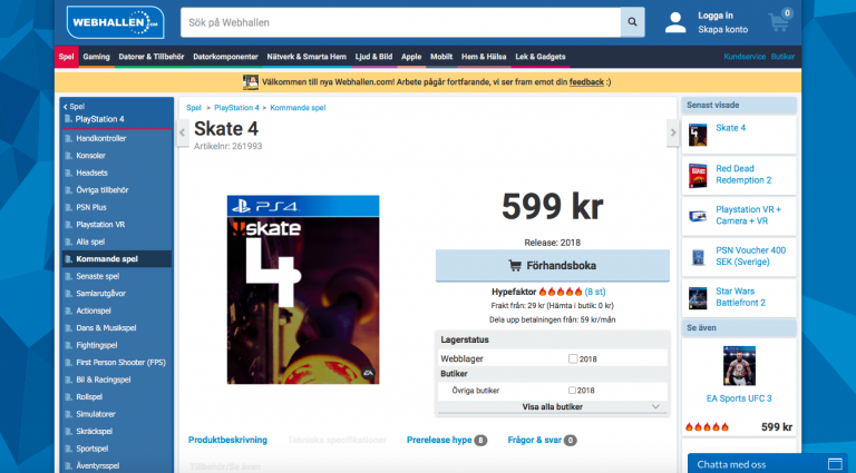 Naime, na stranici švedskog retailera osvanula je produktna stranica za Skate 4, koji bi navodno već ove godine trebao stići na PS4 i Xbox One konzole te bi trebao koštati 599 kr (oko $74, no cijene kod navedenog retailera inače su nešto više od uobičajenih). Na produktnoj stranici nalazi se i box art za koji moramo biti pomalo sumnjičavi, no ukoliko se radi o “pravoj stvari” moguće je da se radi o privremenom vizualu dok EA ne objavi službeni.
