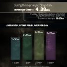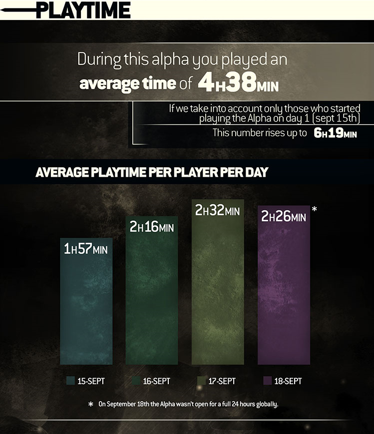 Igrači su u alphi proveli u prosjeku 4 sata i 38 minuta, od koga je najviše vremena otpadalo a igranje 4 vs 4 Dominion moda (oko 55% vremena), dok je najmanje vremena provedeno u Duel i 2 vs 2 Brawl modovima (oko preostalih 45%). Za vrijeme trajanja alphe, 5% igrača uspjelo je napredovati do 21.levela, a najuspješniji i najimpresivniji je bio igrač koji je dogurao čak i do 121. levela, pri čemu je proveo približno 53 sata u igri, igrajući s Orochijem.