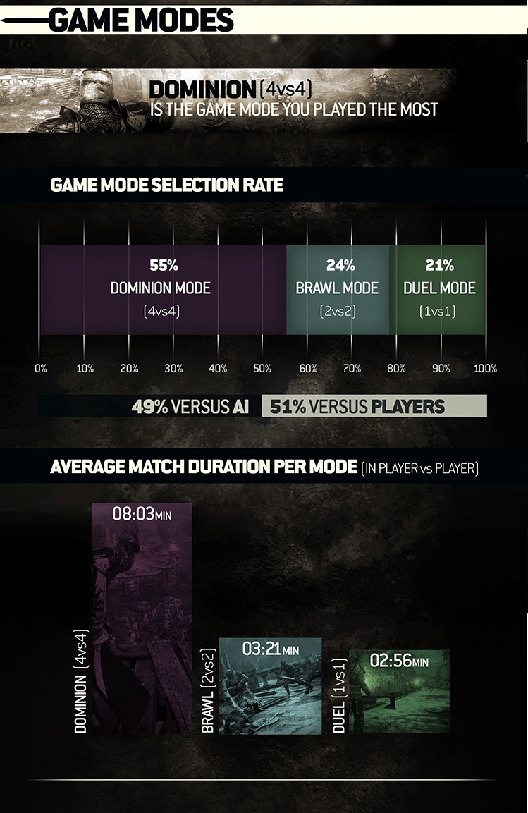 U 1 vs 1 Duel Modu, najuspješniji su oni koji su igrali s vikinškim Raiderom (54%), a potom oni koji su igrali sa samurajima Orochijem i Kenseijem (na oko 50%), ddok su vitezovi Conqueror i Warden podjednako uspješni (49%). Najlošije stoji viking Berserker s 45% omjera pobjeda.