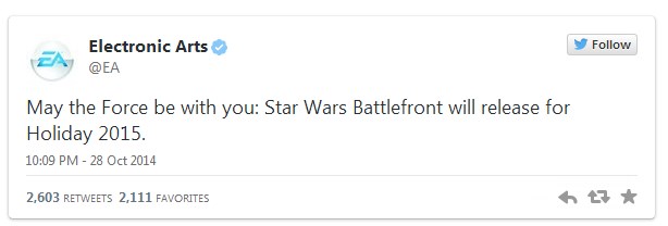Iako su mnogi očekivali da će se Star Wars: Battlefront pojaviti idućeg ljeta, činjenica da igra izlazi krajem godine u neku ruku predstavlja logičan potez izdavača, pogotovo ukoliko u obzir uzmemo da je premijera filma Star Wars: Episode 7 zakazana za 18. prosinac 2015. godine.