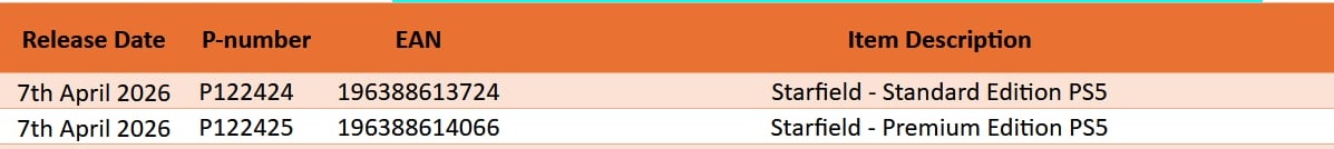 Informacija o izlasku isplivala je putem poljskog portala PPE.pl, koji je došao u posjed internih dokumenata jednog od distributera videoigara. Prema tim podacima, Starfield bi na PlayStation 5 trebao sletjeti 7. travnja. Iako PPE ima solidan renome kada su u pitanju leakovi o fizičkim izdanjima, treba biti oprezan jer su njegove nedavne tvrdnje o izostanku fizičkih kopija za GTA VI brzo opovrgnute. Ipak, screenshot internog sustava koji su priložili djeluje prilično uvjerljivo i precizno cilja na početak drugog kvartala.