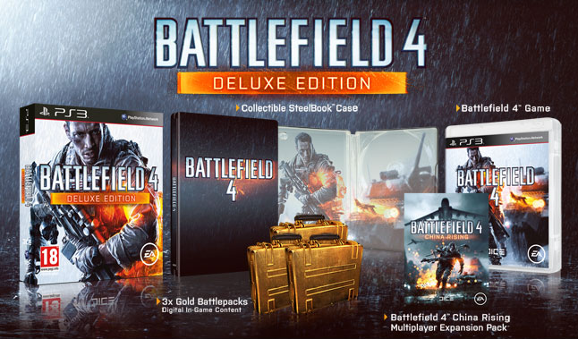 Deluxe izdanje se sastoji od China Rising expansion packa, Steelbook covera i tri Gold Battlepacka, koji će biti veoma korisni pri multiplayer igranju (svaki od tri Battlepacka sadržavat će novo oružje, dog tagove, noževe, XP boostere i iteme za customiziranje likova). Battlefield 4 Deluxe Edition će biti moguće kupiti po cijeni od £64.99.