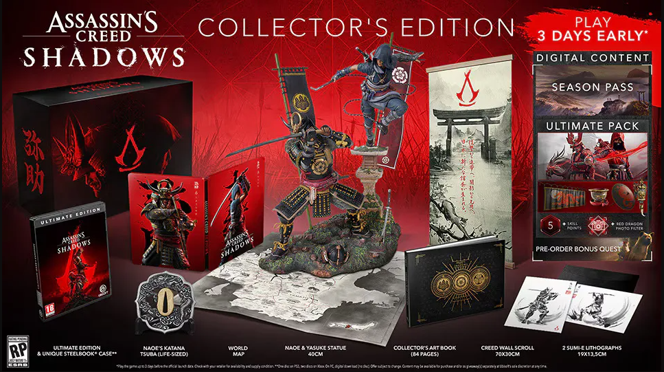 Assassin’s Creed Shadows Collector’s Edition je doista jedno od najimpresivnijih izdanja koje smo dosad vidjeli, kada je u pitanju ovaj serijal, a predstavlja pravu malu poslasticu za sve kolekcionare. Assassin’s Creed Shadows Collector’s Edition košta $239.99, a osim ultimativnog izdanja igre sastoji se od nekoliko sjajnih dodataka. Tu je, prije svega, fantastična, ručno obojena 40cm visoka statua Naoe i Yasukea. Osim statue, u ovom izdanju se još nalazi i ekskluzivni steelbook, kolekcionarski artbook sa impresivnim litografskim printovima, dvije litografije dimenzija 19x13cm, držač za katanu u prirodnoj veličini, prekrasna mapa svijeta i japanska zidna tapiserija površine 70×30 cm. Sve navedeno bit će upakirano u posebnu kolekcionarsku kutiju, koju također možete vidjeti na slici ispod.