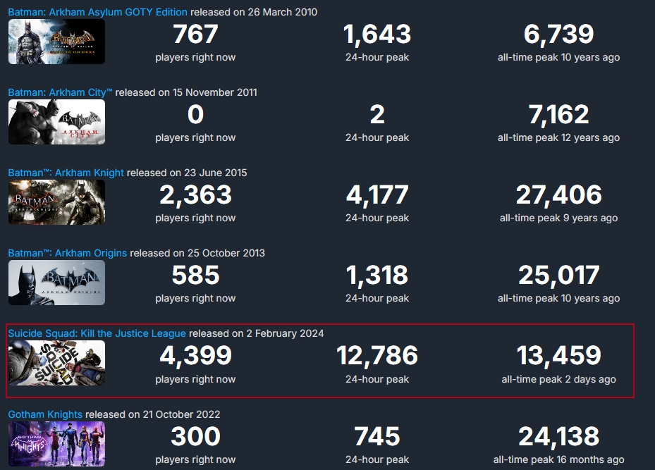 Osim toga, ova igra sada predstavlja jedno od najslabijih izdanja Warner Bros. ponude na Steamu kad je u pitanju broj konkurentnih igrača. Ostaje iza naslova kao što su Gotham Knights (24.1 tisuća), Mad Max (33.3 tisuća), Mortal Kombat 1 (38.1 tisuća) i Middle-earth: Shadow of War (68.1 tisuća), bez da uopće spomenemo Hogwarts Legacy (879 tisuća).
