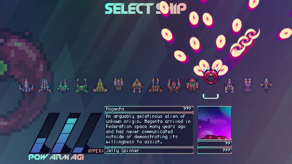 U arkadnom modu prije svake misije na izboru nam stoji četrnaest različitih pilota, tj. letjelica koji sačinjavaju Galaxy Squadron. Svaka je jedinstvenog dizajna, različitih statistika i primarnog, odnosno sekundarnog oružja. Takve varijacije omogućuju nam taktički pristup izazovu koji nas očekuje. Ukoliko nam odabrana letjelica ne odgovara, vrlo ju jednostavno na početku svake misije možemo promjeniti za bilo koju drugu unutar Galaxy Squadrona. Kako bi priča bila bogatija, svaki pilot ima opisanu kratku biografiju unutar koje saznajemo detalje o svijetu, odnosno univerzumu u kojem se napucavamo.