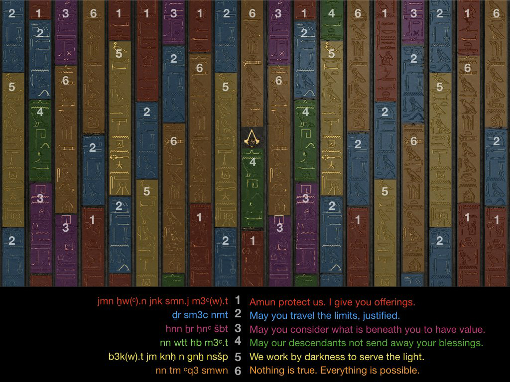 Detaljnijim pregledom reklamnog materijala i hijeroglifa, Manningova je otkrila kako isti nisu nasumično naredani čisto radi reklame, već da se radi o smisleno složenom tekstu koji i te kako ima veze s radnjom Assassin’s Creed Originsa i periodom u kojem će se ista odvijati. Kako glasi kompletan prijevod hijeroglifa s reklamnog materijala, pogledajte na slici ispod.