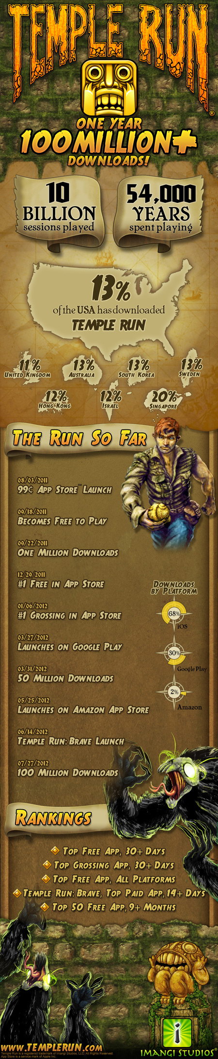 Mobilna senzacija Temple Run, sprint-’em-up iz trećeg lica, ostvarila je ogroman uspjeh sa više od 100 milijuna downloada u godinu dana od izlaska, potvrdio je developer Imangi Studios.