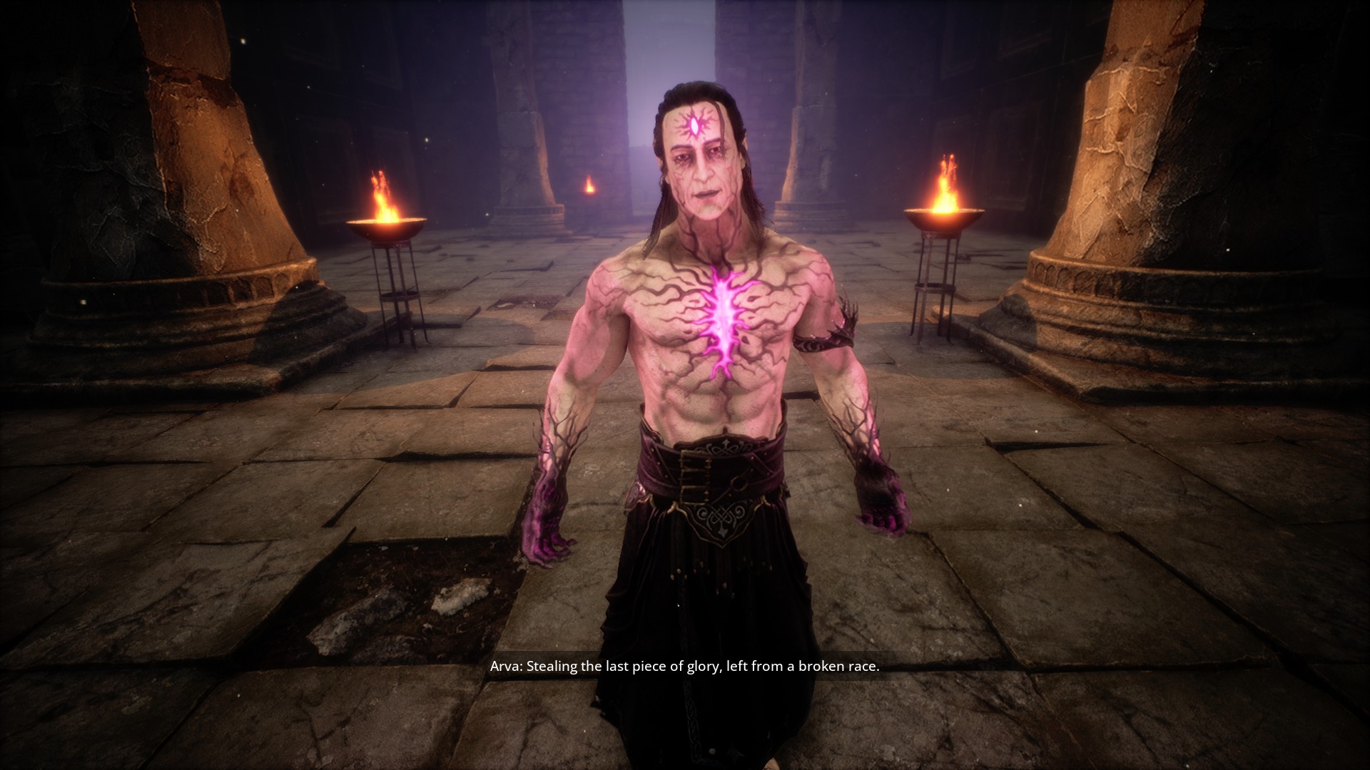 Preuzimamo ulogu Arana, kralja „Visokih Ljudi“ kojeg je izdao brat i oduzeo mu moći. Aranov cilj je sada da vrati svoju moć tako što će pronaći moćne artefakte kako bi porazio svog brata i obnovio kraljevstvo koje je preuzela tama. U previewu sam napisao da su elementi priče vrlo dobri, da razumijemo pozadinsku ideju igre. Međutim, s time se više ne mogu složiti. Priča je loše uvedena, istražena i izvedena. Od nas se očekuje da se složimo s puno zapleta koji nam nisu objašnjeni kao što su, primjerice, detalji o kraljevima i Aranovoj obitelji, bogovima, rasama i drugim informacijama koje se nasumično spominju i nemaju pravu dubinu. Pojavit će se i neki nasumični likovi o kojima ne znamo ništa i zašto su tu gdje jesu. Jako je čudno što se Aranov brat stalno pojavljuje ispred nas i ne želi nas ubiti dok gleda kako uzimamo artefakte i ništa ne poduzima s tim… Svi ti elementi također se raspadaju kada je riječ o dijalogu i Aranovom pripovijedanju. Primjerice, Aran vrlo često govori neke naizgled očite stvari: „Vidim dobar mač, možda će poslužiti“ ili „Ovo čudnovato stvorenje koje me ganja baš je naporno“. Sama glasovna gluma nije najbolja, ali ni ne možete bolje očekivati od indie studija.