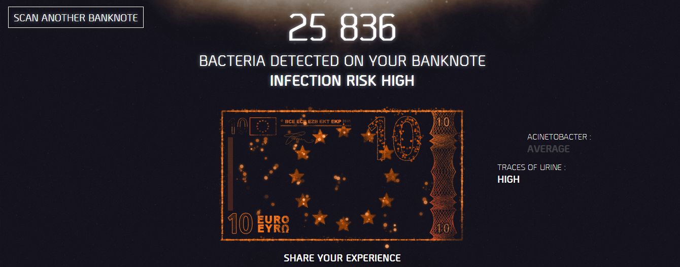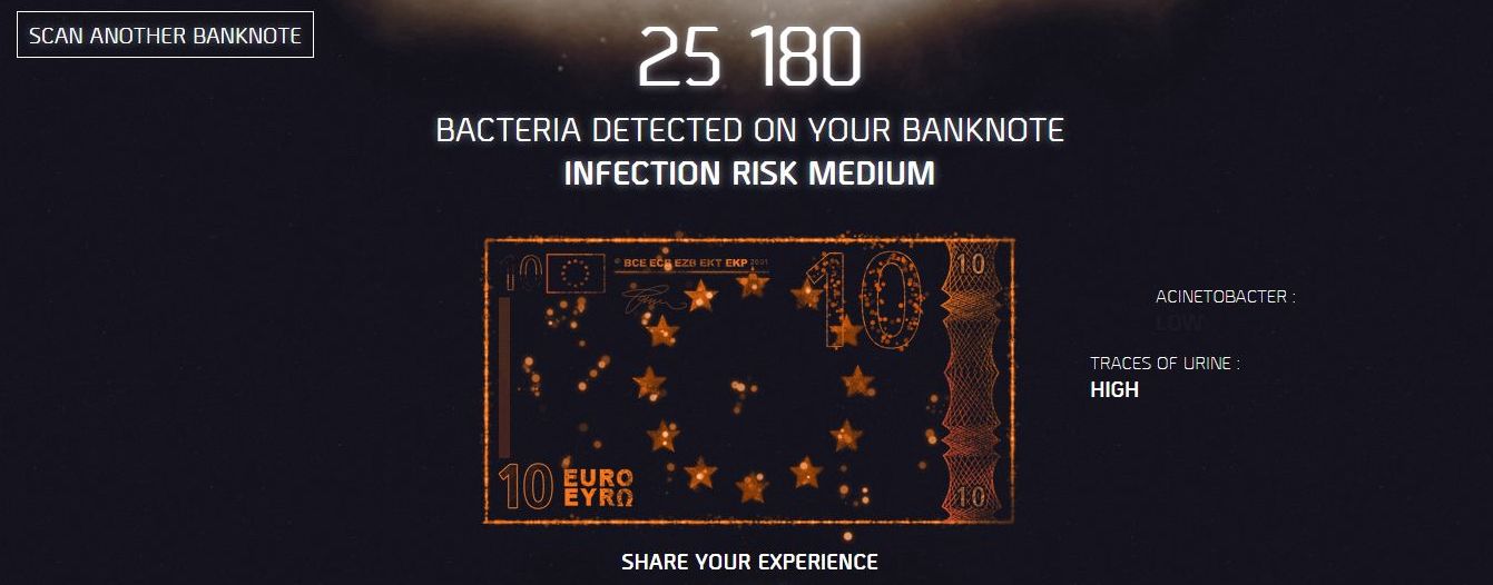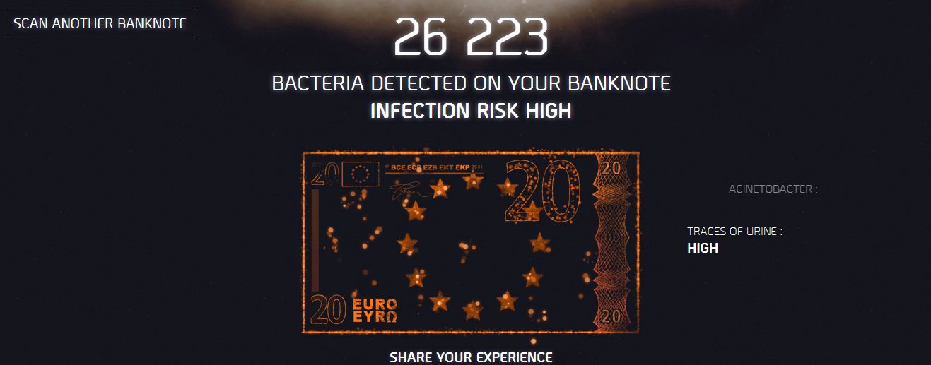 Skeniranjem novčanice (trenutno je objavljena podrška za eure i funte) ili navođenjem vrijednosti iste s njezinom serijskim brojem, moći ćemo doznati gdje je i kada novčanica printana te koliku prosječnu količinu urina, kokaina, marihuane i bakterija možemo pronaći na njenoj površini. Nakon toga, sajt će izračunati potencijalni rizik od zaraze.