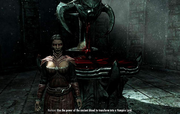 Govoreći o volji i strpljenju isto je potrebno i za ulogu vampira, jer ako se igrač odluči postati jednim, ima nekoliko iritantnih uvjeta na koje se mora naviknuti, no s druge strane zato i puno više moći koje može iskoristiti. Kao prvo, preobrazbom se ne postaje više tipičan vampir kakav se moglo biti u prethodnom Oblivionu ili također tu u Skyrimu, već se radi o Vampire Lord vrsti koja ima dva oblika. Prvi ljudsko-vampriski, te drugi koji je novitet, a to je ta Lord mogućnost pomoću koje se postaje krvopijska zvijer u punom smislu te riječi. Recimo nešto kao moćnija verzija Gargoylea. Upravlja se isključivo iz trećeg lica kao i vukodlak, no ima razne moći, može „preletjeti“ u obliku šišmiša s jedne strane na drugu u trenu, sisati energiju na daljinu, telekinezom privući i skršiti protivnika (kao Darth Vader recimo) ili se vratiti u ljudski oblik pa koristiti nove moći poput zlosutnog zavođenja, noćnog vida, potpune nevidljivosti u čak 2 i pol minute itd. Dakle puno je toga korisnog samo kad bi bilo fluidnije i lakše izvedivo, no sada to su uvjeti na koje morate pristati što čak i nije tako loše jer opet je puno bolje nego što je bilo u originalnom Vamp obliku u Skyrimu kad je izašao.