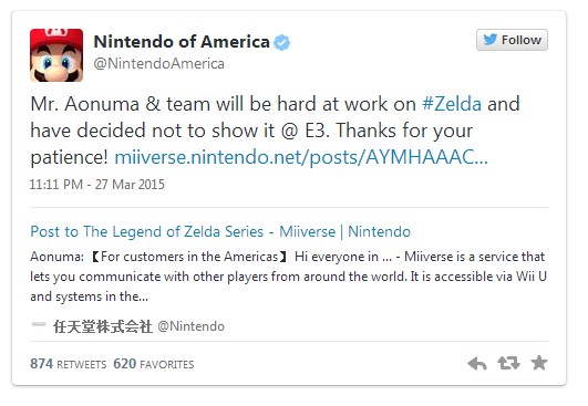 Vijest o odgodi dugoočekivane nove Zelda igre potvrđena je od strane producenta igre Eijija Aonume, koji je u video obraćanju putem službenog The Legend of Zelda Facebook Fan Pagea otkrio da igra neće izaći ove godine.