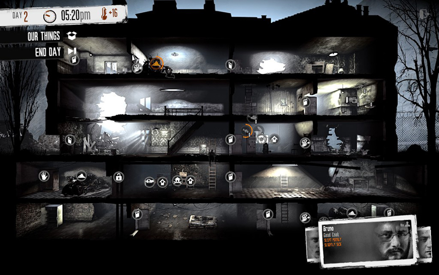 Sve ovo je dio dnevne faze igre, kojom ćete zbunjeno klikati i dočekati noć. I dok po dnevnom svjetlu lunjate tom jadnom isprikom za kuću, jer izlazak van podiže vaše šanse za iznenadni dar snajperskog metka, noć je vrijeme kad tu kuću možete i napustiti, ali samo s jednim likom. Po noći možete trčati komšilukom i pljačkati obližnje i ne tako obližnje kuće. Dok vam je vaš dom u potpunosti otkriven, kuće koje pljačkate će biti prekrivene maglom rata, što dodaje samoj napetosti tog nemoralnog čina. Kuće uglavnom nisu prazne, nego će biti nastanjene s istom vrstom ratnih nesretnika, tako da je potreban maksimalan oprez.