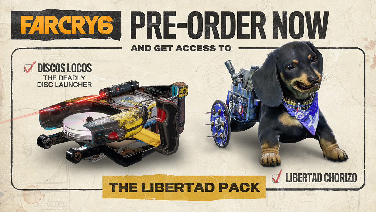 Igra je već dostupna za prednarudžbu, a osim njenog standardnog izdanja, u ponudi će se naći još njih nekoliko. Ukoliko napravite pre-order igre, na poklon ćete dobiti Libertad Pack, koji se sastoji od Libertad outfita za Chorizoa te oružje Discos Locos. Far Cry 6 Gold Edition sastoji se od osnovne igre i Season Passa, dok se u Ultimate Editionu, pored svega navedenog, nalazi još i Ultimate Pack koji se sastoji od Jungle Expedition, Croc Hunter i Vice packova.