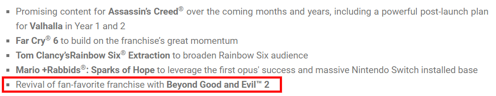 Prije samo nekoliko sati, Ubisoft je objavio svoje financijske rezultate i predviđanja za 2021. i 2022. godinu. Unutar ovog izvještaja možemo vidjeti odjeljak u kojem jasno stoji: “Beyond Good and Evil 2 nastojat će oživjeti omiljenu franšizu”.