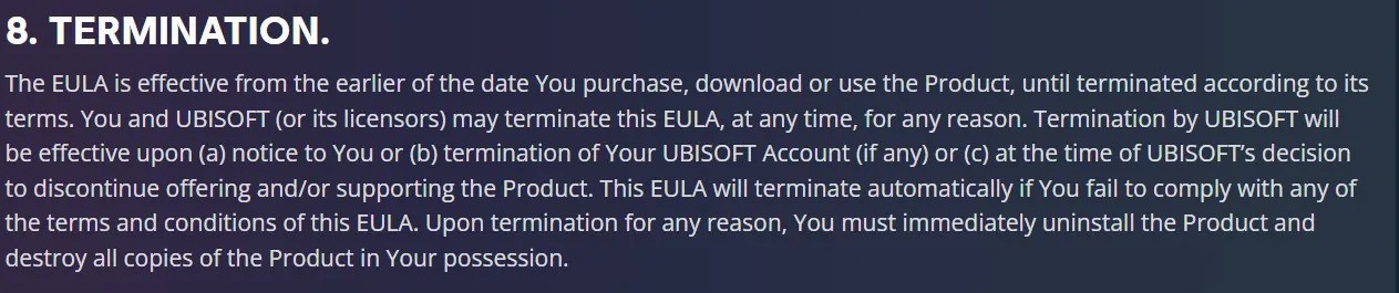 Prema novim pravilima, Ubisoft ili njegovi licencodavci mogu, bez prethodne najave i iz bilo kojeg razloga, prekinuti važenje korisničkog ugovora. U tom trenutku, korisnik se obvezuje odmah ukloniti i uništiti sve primjerke igre, što, za digitalne proizvode, uključuje i fizički medij ako postoji. Povrh toga, studio si ostavlja pravo da u bilo kojem trenutku izmijeni svoj proizvod, sa ili bez opravdanja, navodeći tehnička poboljšanja kao jedan od mogućih razloga.