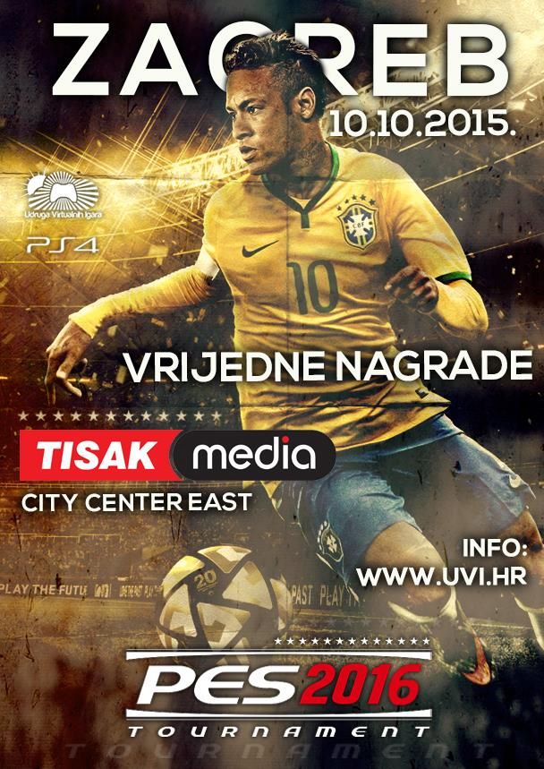 Turnir u jednom od najpopularnijih serijala sportskih videoigara, održat će se 10. listopada 2015.g. u trgovačko-zabavnom centru City Center one Zagreb East (Zagreb, Slavonska avenija 11d) ispred multimedijalne knjižare Tisak media na razini -1. Sudjelovanje na turniru je potpuno besplatno i otvoreno za sve zainteresirane, bilo da se radi o zaljubljenicima u videoigre ili eSports natjecanja. Premijerno natjecanje u videoigri Pro Evolution Soccer 2016 u Hrvatskoj, nastavit će se 24. listopada 2015.g. u City Center one Split (Split, Vukovarska 207) na nultoj razini pored multimedijalne knjižare Tisak media.