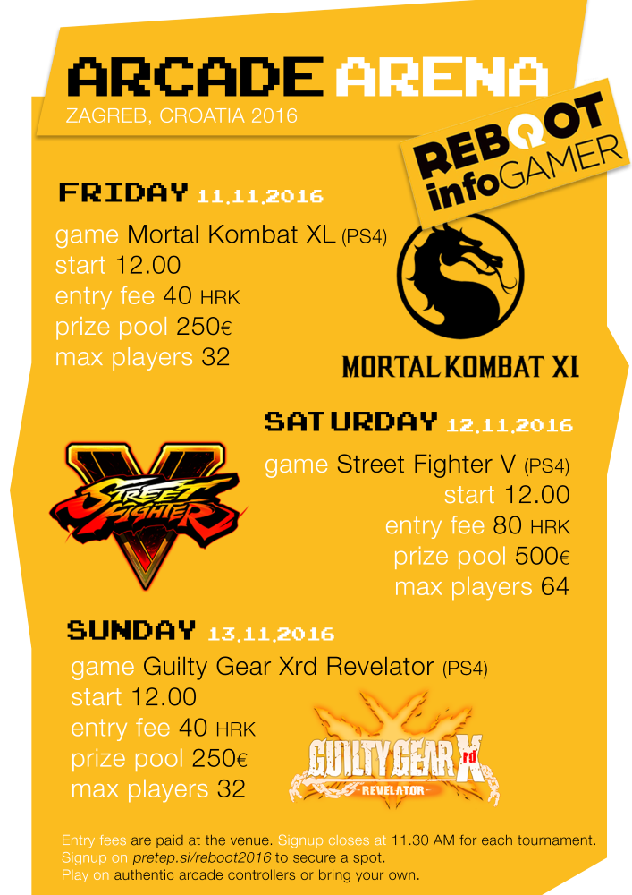 Ovogodišnji Reboot infoGamer donosi puno događanja, no jedan od njih će svakako zanimati sve one gamere i gamerice koji već dugo vremena žude za kvalitetnim turnirima u fighting igrama u Hrvatskoj. Ove godine održati će se nekoliko turnira i to u igrama Mortal Kombat XL, Street Fighter V i Guilty Gear Xrd Revelator. ”Slovenska udruga “Pretep” imat će svoj panel i setupse na 60 m2 gdje ćete se moći potpuno besplatno okušati u Street Fighter V, Mortal Kombat XL, BlazBlue, Guilty Gear i drugim fighting igrama. Dečki iz Pretepa će ujedno i prodavati fight stickove, te se s njima možete dogovoriti oko modifikacije sticka ili kupnje custom sticka.” – navodi se u obavijesti objavljenoj na Reboot forumu.