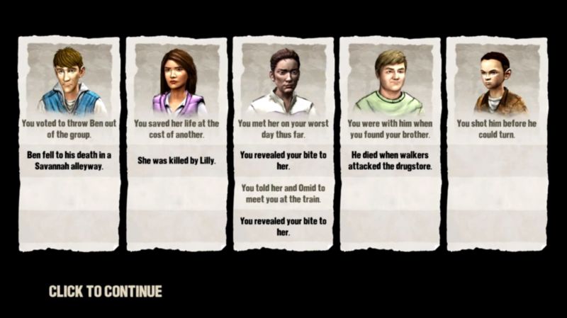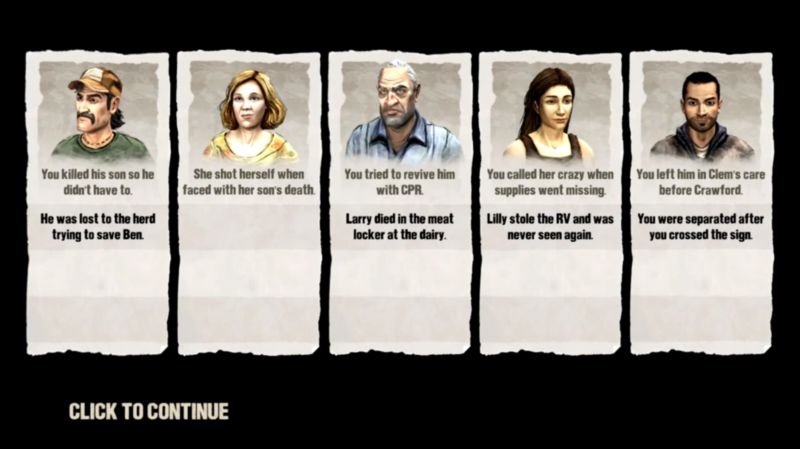 Primijetili ste, indirektnim prepričavanjem Walking Deada pokušavam izbjeći izravno otkrivanje događaja u igri. Ako ikada zaigrate ovaj naslov, sjetiti će te se ovih riječi. Prava je šteta otkriti detalje. Čak i slike izabrane za galeriju ne prenose priču u potpunosti. Neke sitnice ipak moram otkriti. Konkretno, fokusirati ću se na troje glavnih likova: Clementine, Leea Everetta i Kennya.