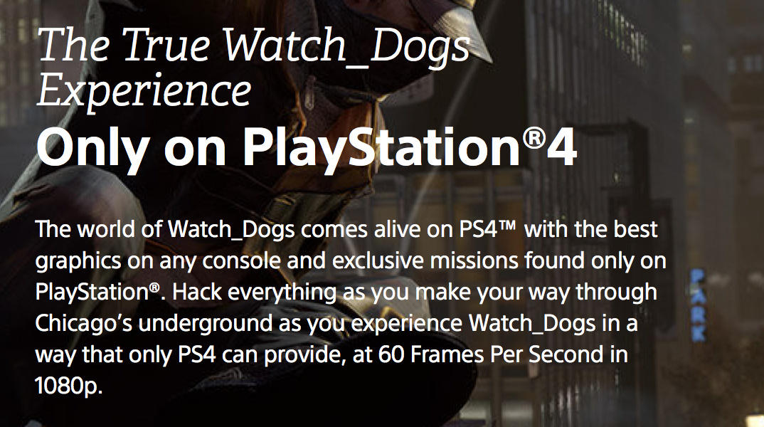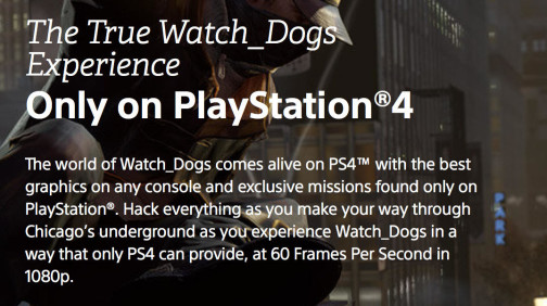 Prije par dana Sony je na svojim stranicama počeo tvrditi da će se Watch Dogs na Playstationu 4 vrtiti u 1080p rezoluciji i 60 sličica po sekundi. Kao što možete vidjeti na dolje priloženoj slici Sony se hvali najboljim vizualnim iskustvom na bilo kojoj konzoli i tim da će igra ići u 1080p/60 fps…