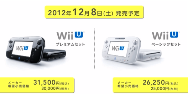 Satoru Iwata je najavio kako će Wii U u Japanu izaći 8. prosinca i biti dostupan u dva modela – osnovnom i premium modelu. Uz osnovni se model dolazit će konzola s ugrađenih 8 GB memorije (koja se može proširiti SD karticom do 32 GB), jedan GamePad, HDMI kabel, kabel za napajanje i AV kabel. Skuplji premium model sadrži konzolu s ugrađenih 32 GB memorije, jedan GamePad, sve kablove kao i osnovni model, dodatna tri stalka za konzolu i GamePad te premium pristup novoj internet ponudi Nintendo Networka, preko kojeg se dobiva 10% popusta na sve artikle u online ponudi.