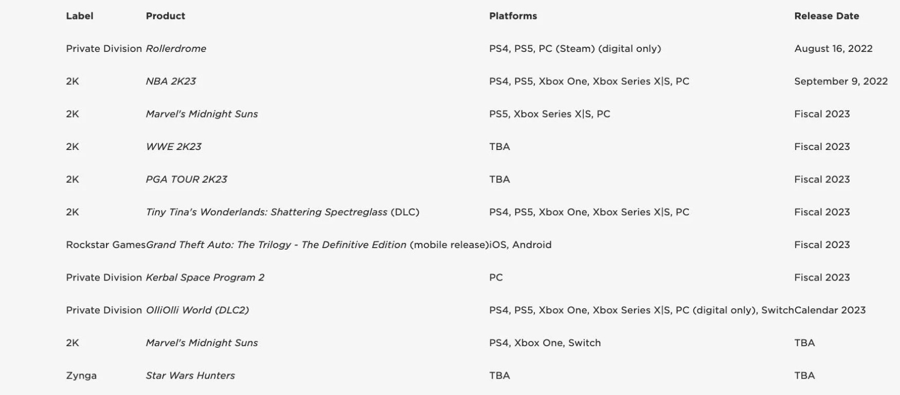 Potvrdu da će WWE 2K23 izaći tijekom iduće fiskalne godine dobili smo zahvaljujući novom financijskom izvješću Take-Two Interactivea, gdje je spomenuta igra uvrštena u planove za navedeni period, zajedno sa još nekoliko naslova kao što su NBA 2K23, Rollerdrome, PGA Tour 2K23, Tiny Tina’s Wonderlands: Shattering Spectreglass (DLC), Grand Theft Auto: The Trilogy – The Definitive Edition (Mobile), Kerbal Space Program 2, OlliOlli World (DLC), Marvel’s Midnight Suns i Star Wars Hunters.