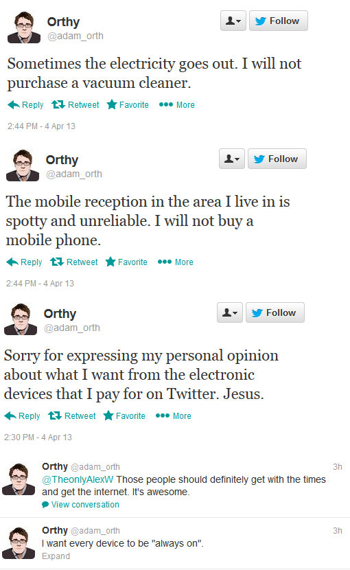 Nije poznato na koji će način veza prema interetu utjecati na funkcionalnost budućeg Xboxa, ali posve je izgledno da će stalni vod biti obvezan. Prema Paulu Thurrottu, novinaru koji je u prošlosti prvi predstavljao sve interesantnije Microsoftove gadgete, allways on sustav je dio sljedećeg Xboxa. Način na koji je ova informacija dospjela u javnost je u najmanju ruku bizaran. Prije nekoliko dana direktor kreativnog odjela Microsoft studija Adam Orth izjavio je putem tweetera kako ne razumije zašto se ljudi toliko živciraju oko allways on konzole. Naravno, njegov tweeter kanal više nije dostupan ali ekipa neogafa je sačuvala nekoliko screenshotova za buduće generacije.