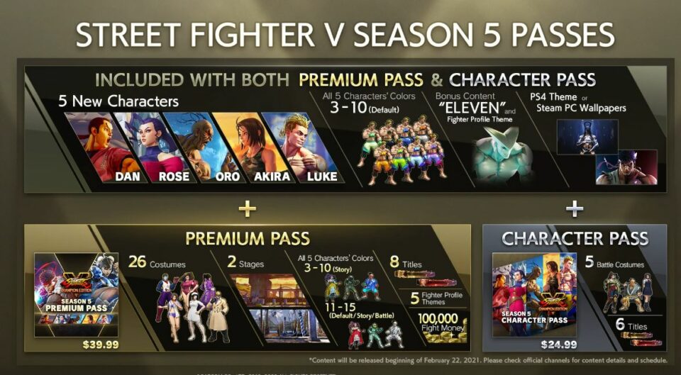 Oro, Akira i Luke dio su Season 5 Character Passa, kao i Premium Passa. Svi osim Lukea, biti će dostupni od 16. kolovoza. Svaki od likova se mogu kupiti zasebno, ako ste uštedjeli nešto Fight Moneya igrajući igru, ili stvarnim novcem, a ponudu pregledajte na PS Storeu ili unutar same igre. Street Fighter V: Champion Edition uključuje sav dodatan sadržaj, veliki broj dodatnih kostima, kao i Capcom Pro Tour DLC te sadržaje iz originalne verzije igre i Arcade Editiona: 40 likova, 34 staze i preko 200 kostima. Peta sezona donosi 5 novih likova, dvije nove staze i 30m novih kostima, te ova velika igra završava sa 45 likova, 36 staza i preko 230 kostima.