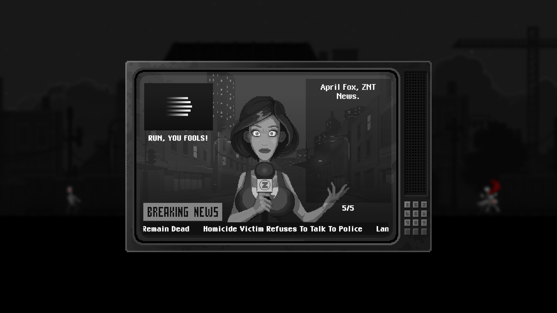 Ali na ZNT kanalu se može očitati i druga jaka strana igre, a to je humor i duhovitost. Osim na TV-u u obliku flash vijesti, taj humor pristutan je u samoj naraciji i dijalozima. Kombinacija simpatične 16-bitne estetike, animacije likova, gibberish jezika i scenarija epizoda, ovu zombi igru pretvara u popriličnio zabavno iskustvo. Primjera radi…prva epizoda prati priču znanstvenika koji uvelike podsjeća na Doc Browna, kako proizvodi drogu za moćnu narco bandu, ali jedan primjerak droge pođe po zlu i stvori zombije. Takvi scenariji su dobrodošli i funkcioniraju kao motiv za odigravanje svih epizoda, kako bi igrači „pogledali“ lucidnost i trud developera, očito velikih ljubitelja trash filmova i kategorije b-produkcije.